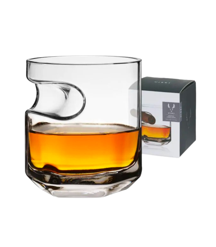 The Crystal Cigar Glass by Viski combines a classic rocks glass profile with a hexagonal base and a built-in cigar rest, creating a unique connoisseur's tumbler. Strikingly clear crystal perfectly shows off the liquor within, while a sturdy angled base provides a satisfyingly hefty foundation. The cigar rest can fit a range of ring gauge sizes, up to 54.