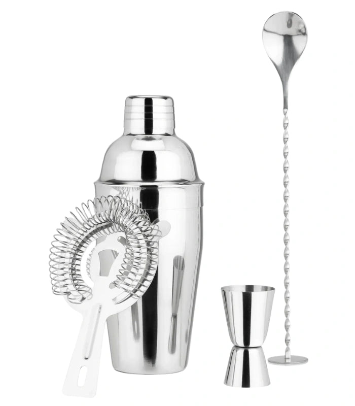 • Quantity: 4-piece set (shaker, spoon, measured pourer, and strainer)