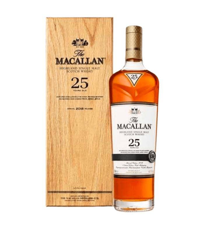 The Macallan Sherry Oak 18 Years Old forms part of our Sherry Oak range which features a series of single malt whiskies matured exclusively in hand-picked sherry seasoned oak casks from Jerez for richness and complexity. A full bodied palate of mature oak, ginger and raisin flavors is complimented by a light mahogany natural color.