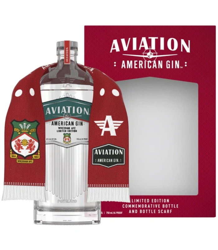 A 750 mL bottle of Aviation Gin and an official Wrexham AFC scarf. -