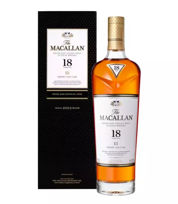 Discover the Macallan Sherry Oak 18 Years Old, 2023 Release - an illustrious member of the coveted Sherry Oak Collection. This masterful single malt whisky has been meticulously matured in hand-selected sherry seasoned oak casks, sourced directly from Jerez, bestowing it with unparalleled richness and depth. Revel in its full-bodied palate, beautifully melding mature oak with hints of ginger and succulent raisins. Its light mahogany hue, a natural testament to its aging process, adds a touch of elegance to every sip. A signature Macallan creation that is both timeless and captivating.