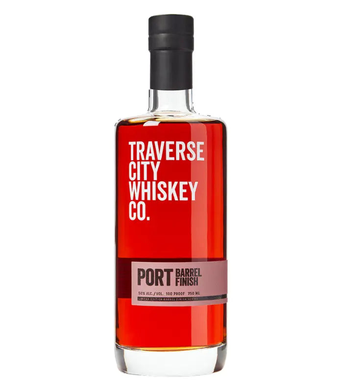 Traverse City Whiskey Co. Port Barrel Finish Bourbon presents a masterful blend of traditional American whiskey-making and the sumptuous richness of Portuguese winemaking. This unique bourbon, aged for five years in traditional barrels, undergoes a transformative finishing process for an additional nine months in massive 300L Ruby Port wine barrels. This innovative aging technique enhances the bourbon's natural sweetness with the sophisticated, fruity notes of Ruby Port, creating a beautifully balanced and complex spirit.